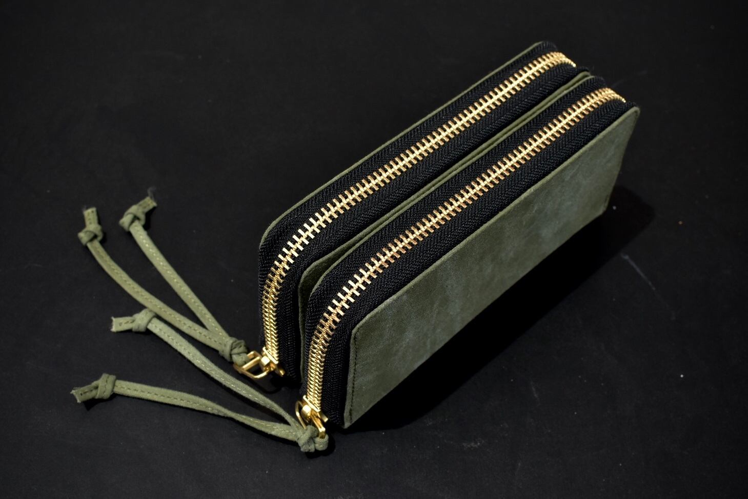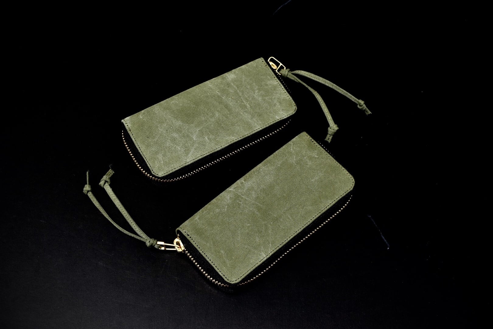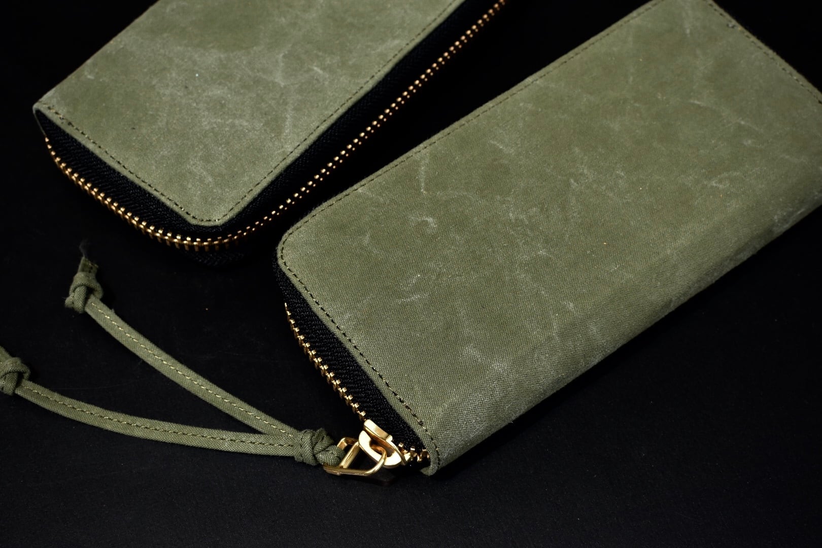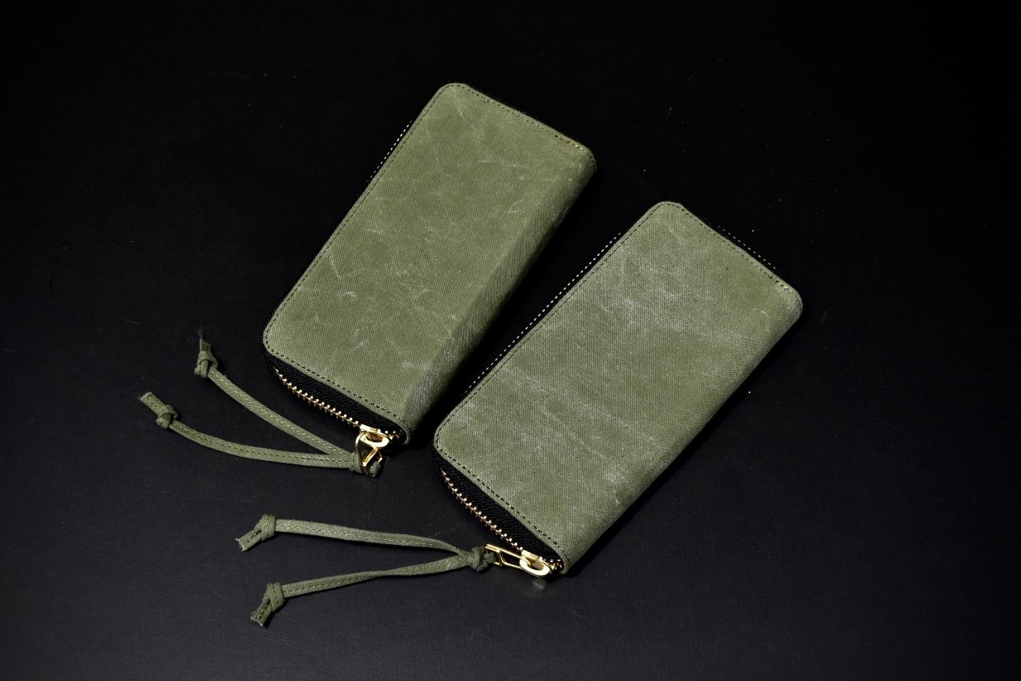 ヴィンテージのミリタリー生地を解体、使用したラウンドファスナー ウォレット。