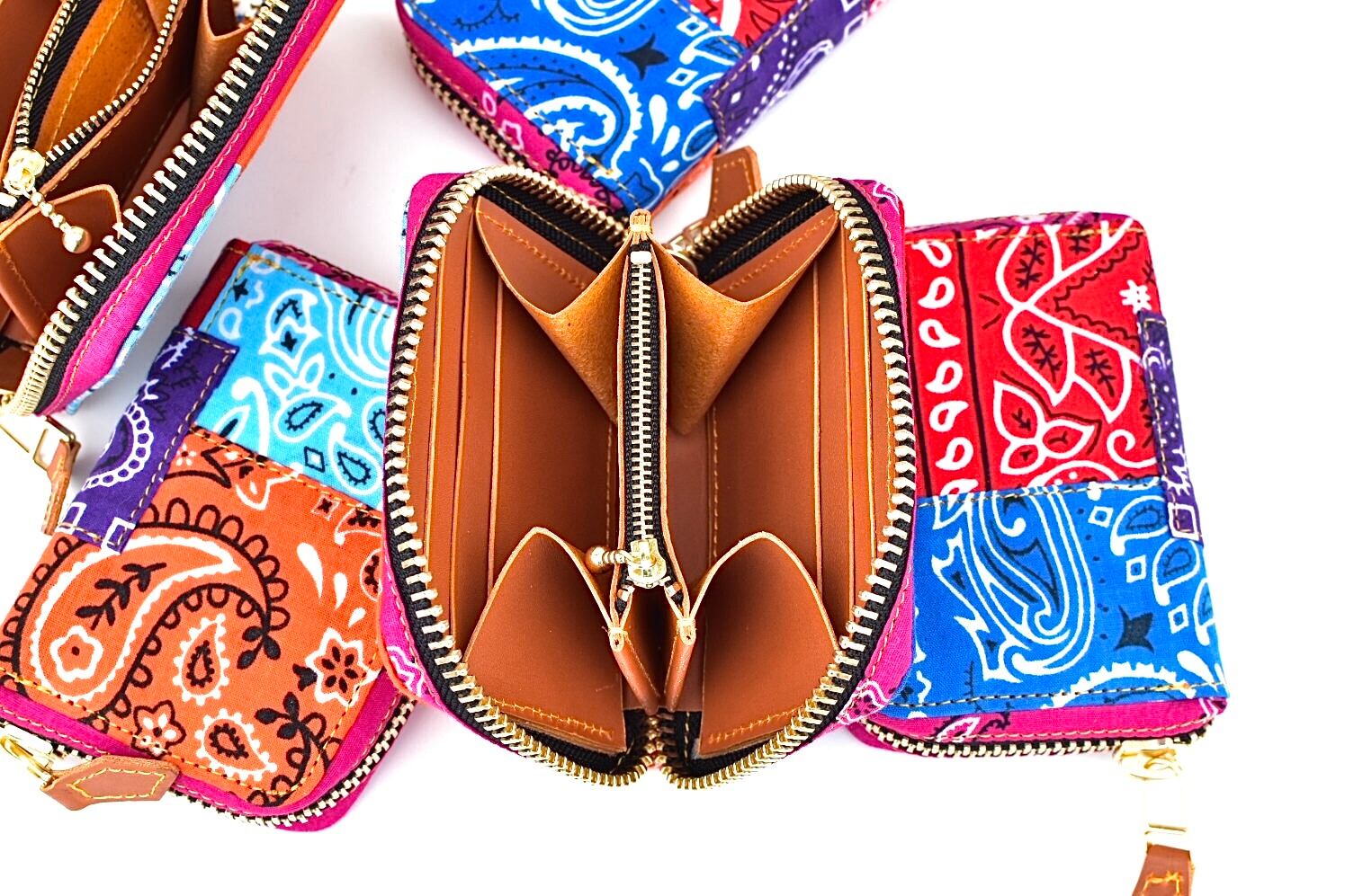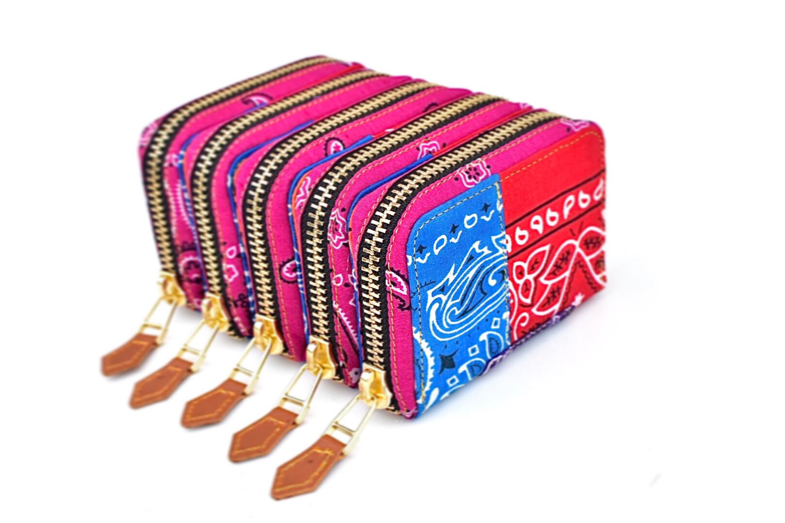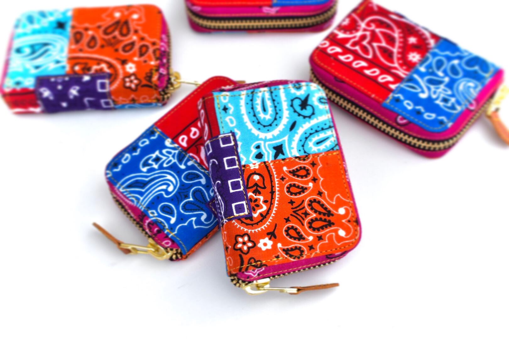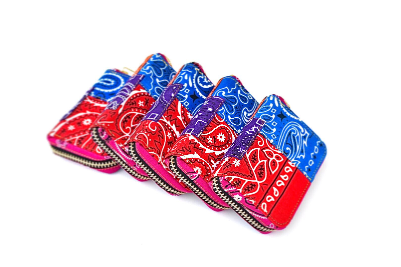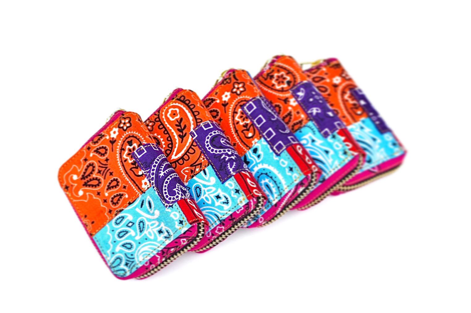 ヴィンテージのバンダナをパッチワークしたラウンドファスナーウォレット。