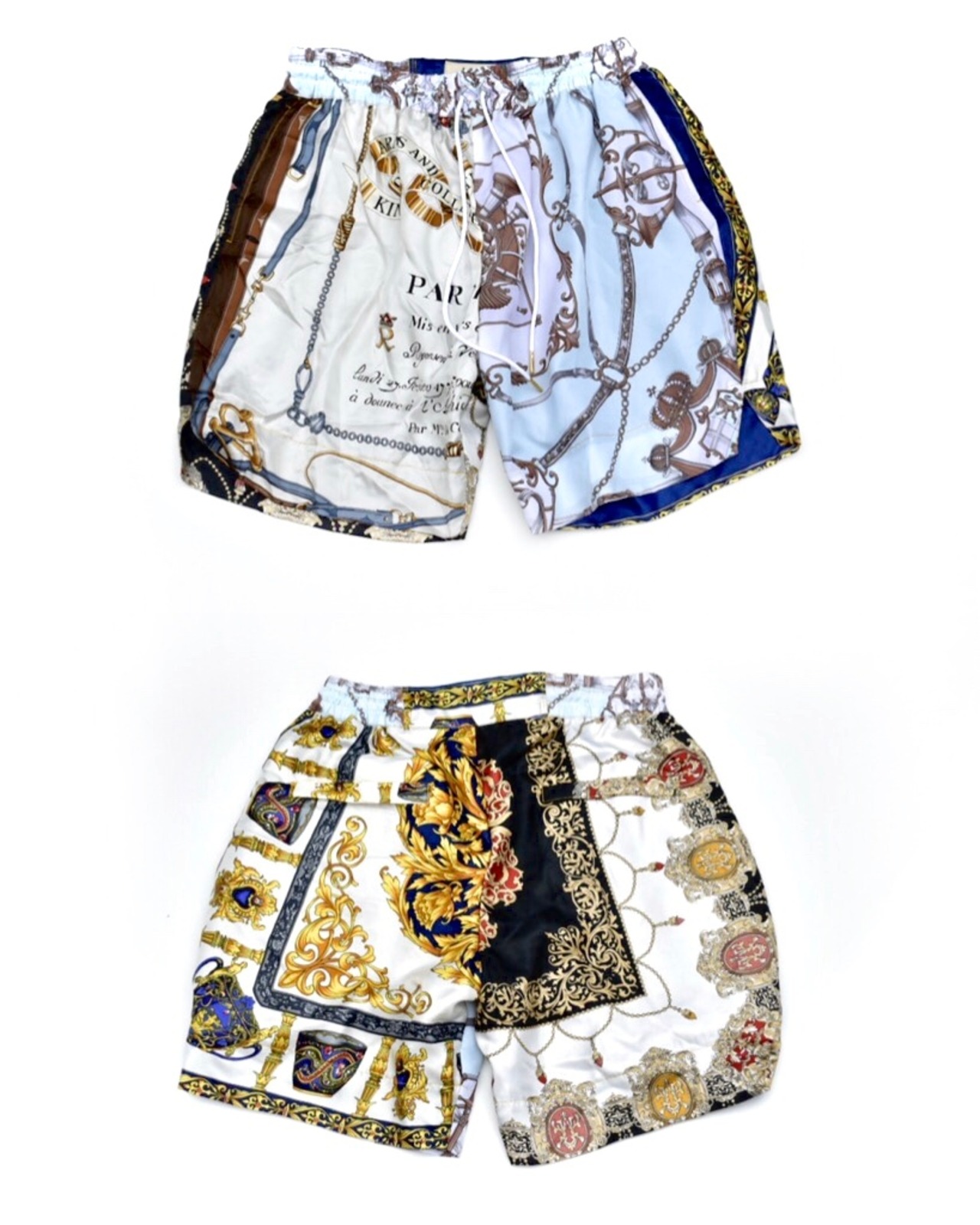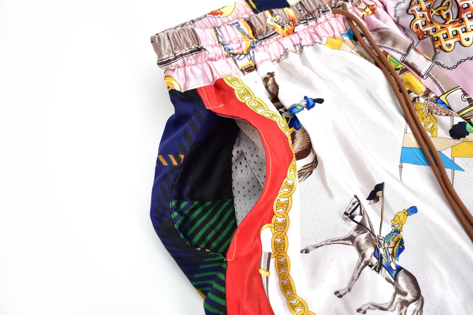 USED スカーフをパッチワークしたバスケットボール ショーツ。
