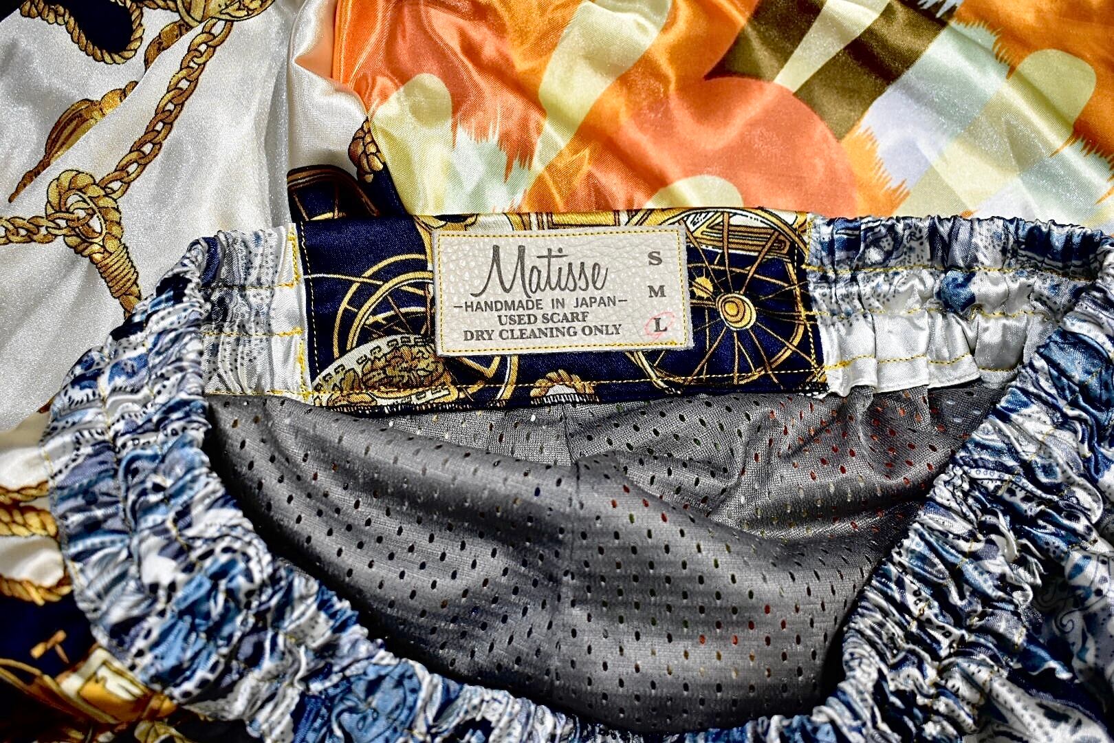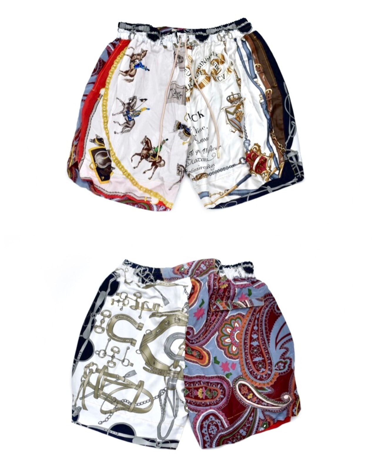 USED スカーフをパッチワークしたバスケットボール ショーツ。