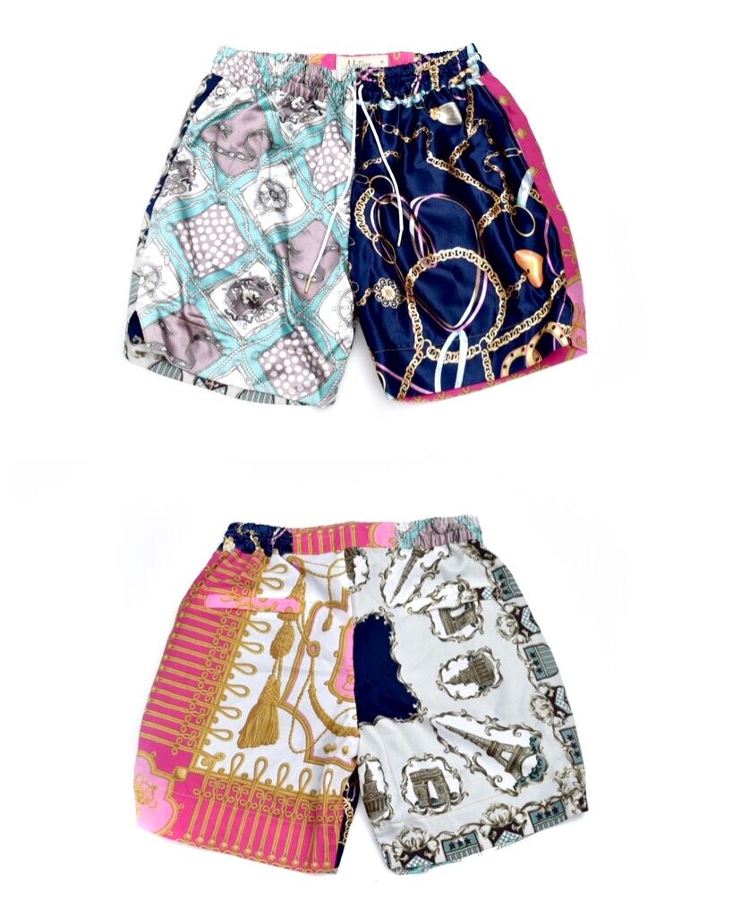 USED スカーフをパッチワークしたバスケットボール ショーツ。