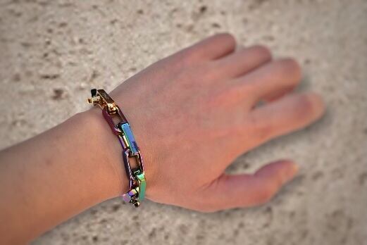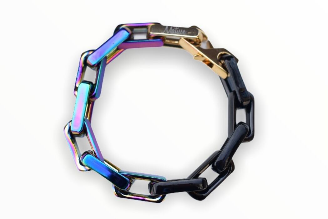 ゴールド、ブラック、玉虫カラーを組み合わせた重量感のあるチェーンブレスレット。