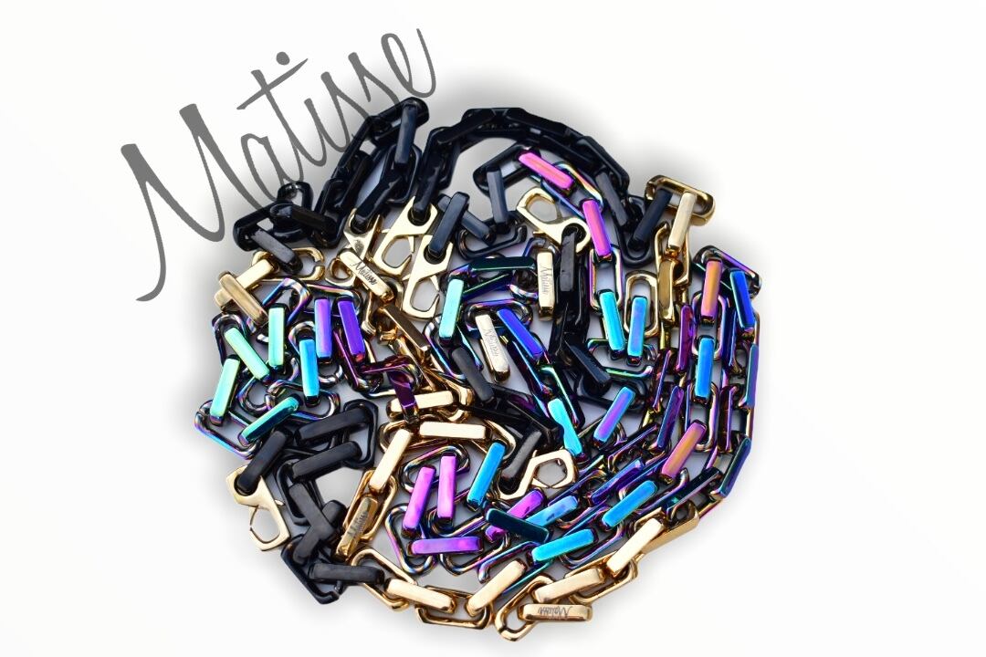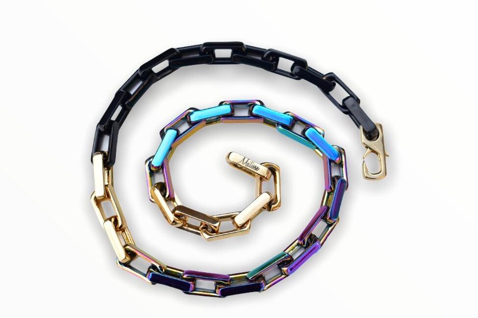 ゴールド、ブラック、玉虫カラーを組み合わせた重量感のあるチェーンネックレス。