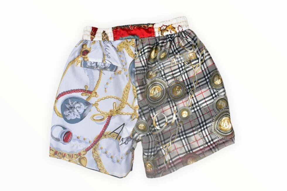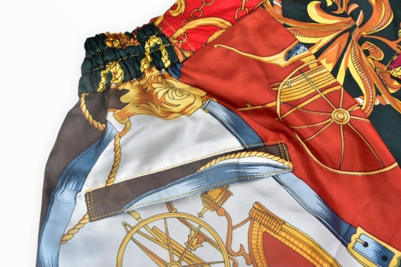 USED スカーフをパッチワークしたバスケットボール ショーツ。