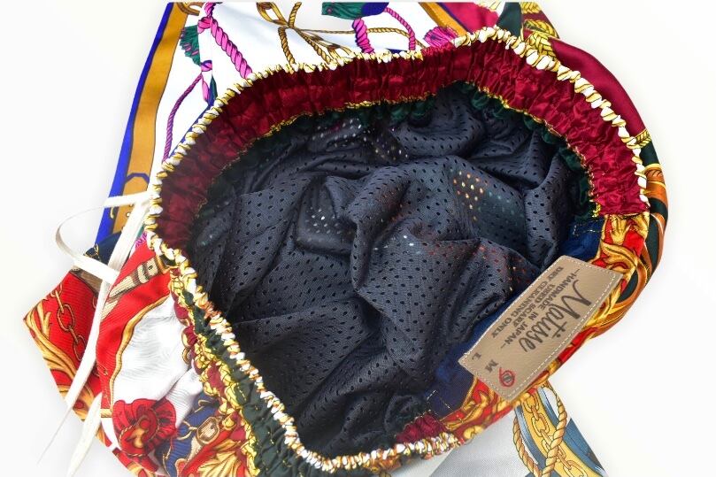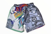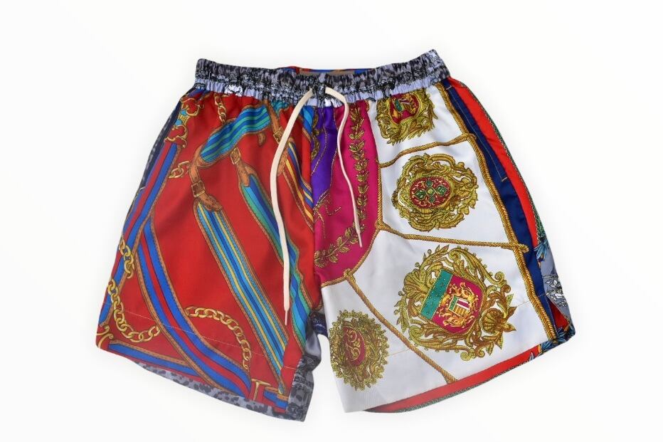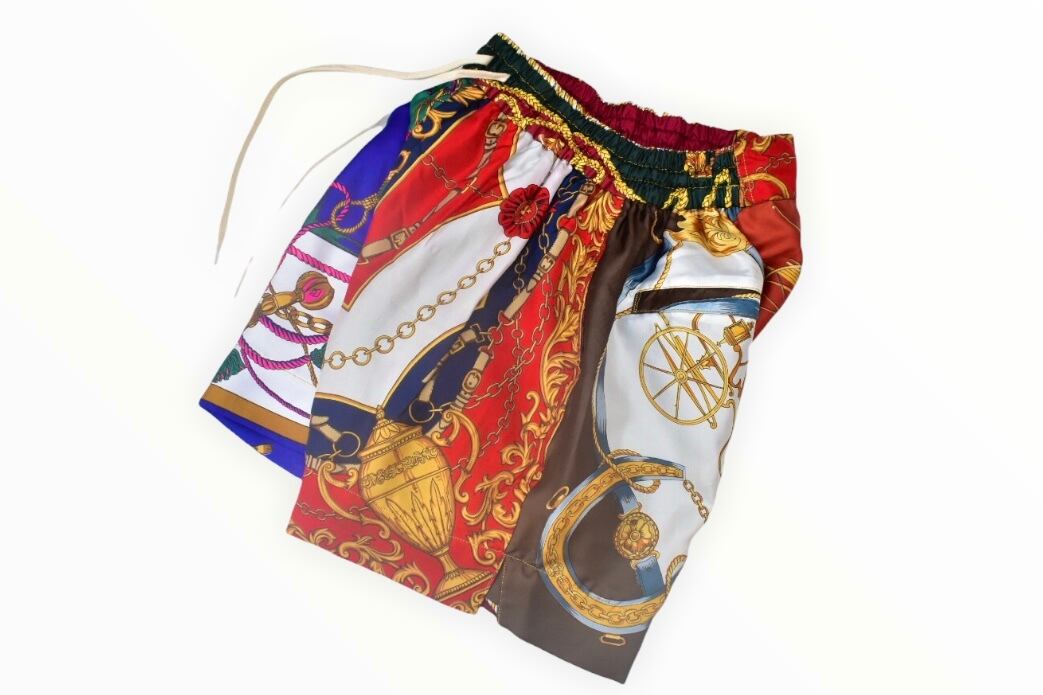 USED スカーフをパッチワークしたバスケットボール ショーツ。