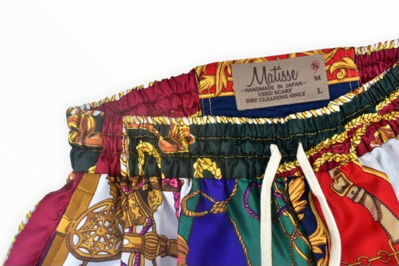 USED スカーフをパッチワークしたバスケットボール ショーツ。